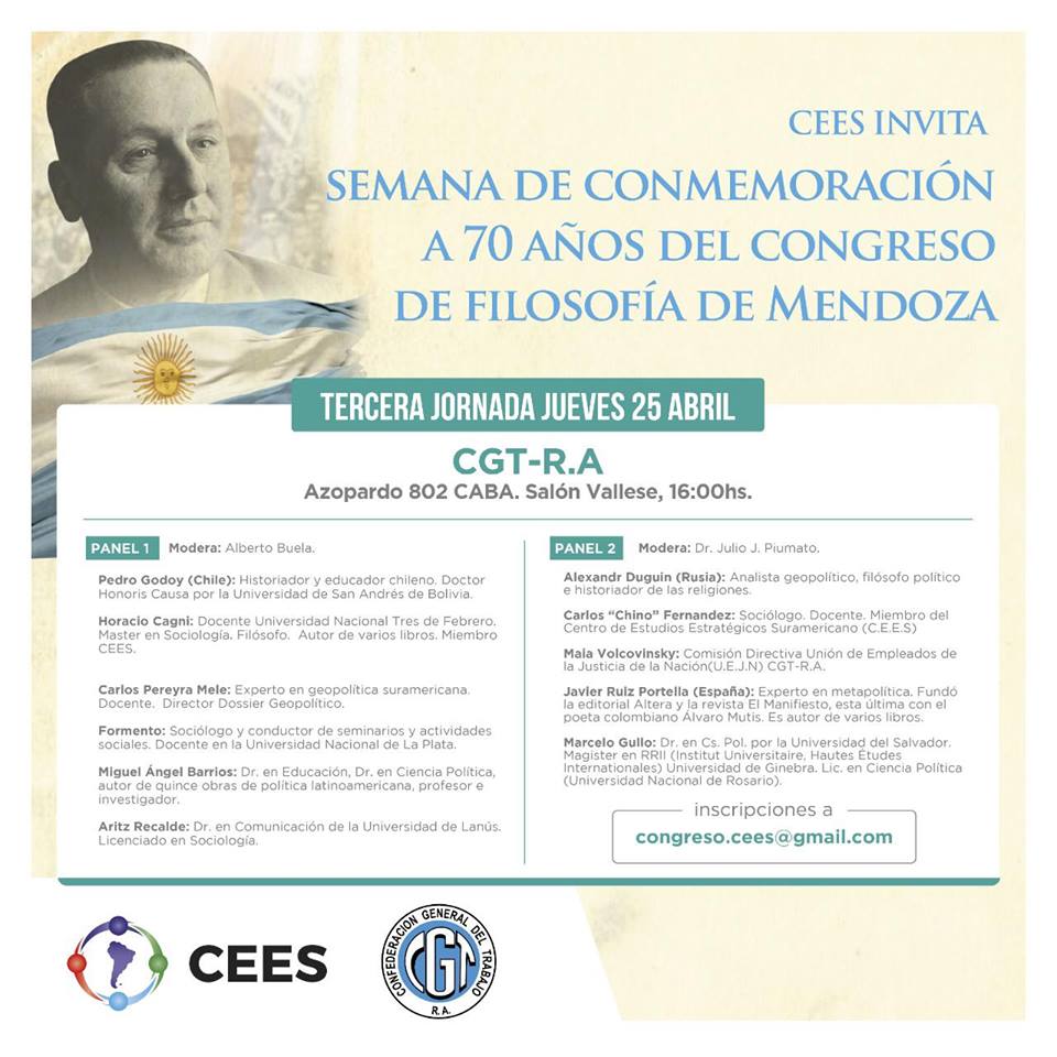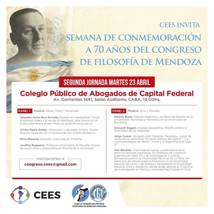En la serie de encuentros de esta semana organizados para conmemorar el Congreso de Filosofía de 1949 Alexander Dugin es acompañado por los argentinos Iciar Recalde, Aritz Recalde, Alberto Buela y Marcelo Gullo, entre otros: