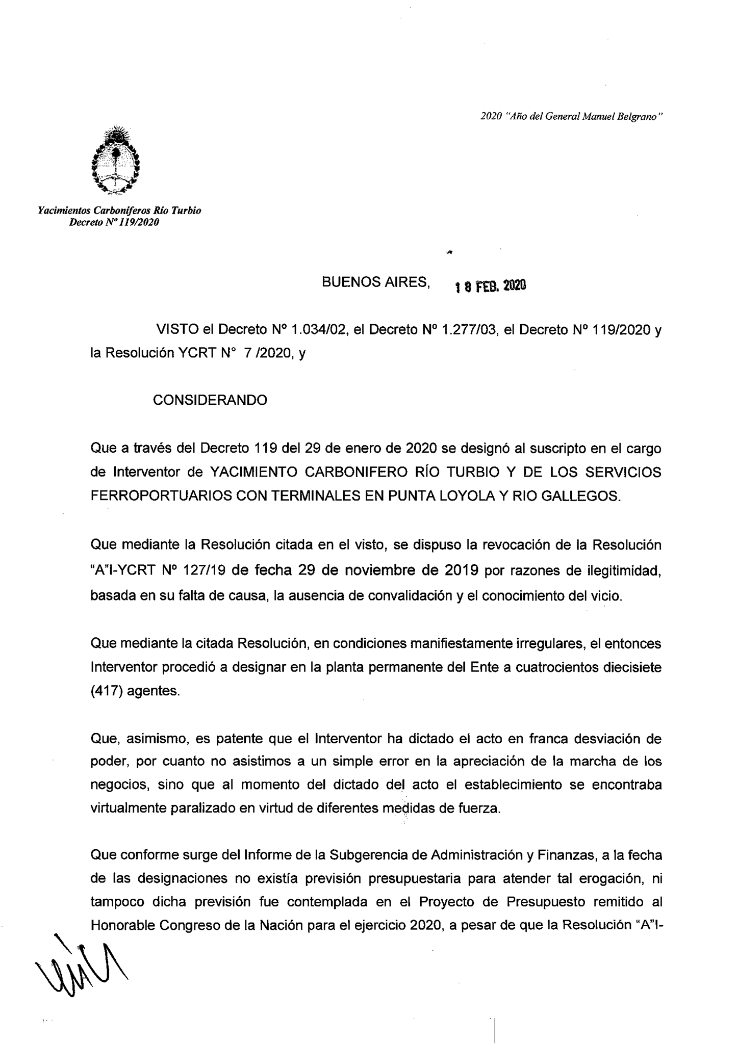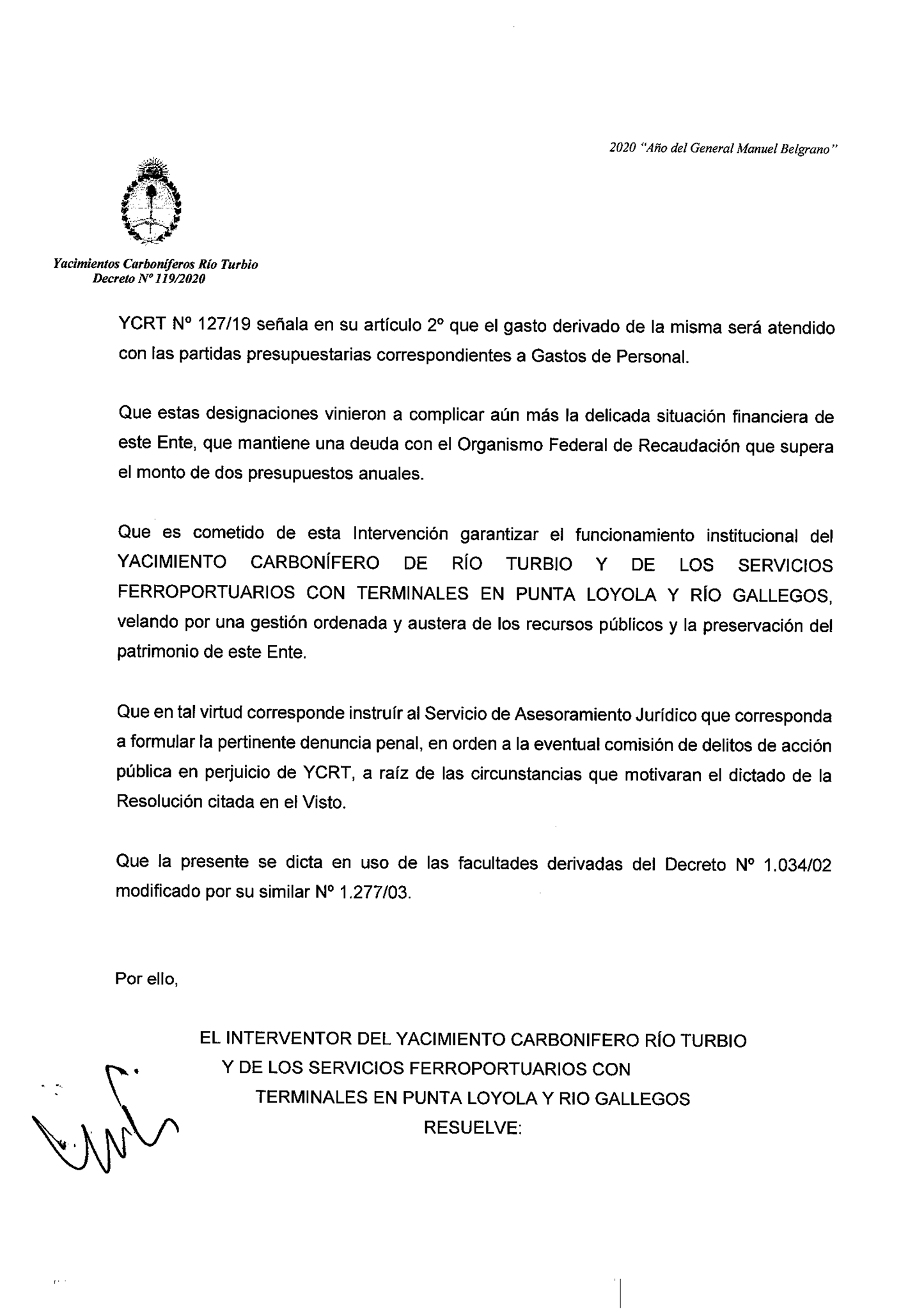 Entre el 8 y 15 de octubre de 2019 el entonces interventor de YCRT – Yacimiento Carbonífero Río Turbio, Omar Zeidán, efectuó la contratación de 417 agentes en planta permanente. Sin viabilidad financiera, la designación se fundamentaba en las supuestas «inversiones programadas», las «inmejorables condiciones creadas por el gobierno» de Macri y la necesidad de contar con mayor personal». Todas falacias, las actividades del complejo se encontraban virtualmente paralizadas por medidas de fuerza del personal y por el estado de crisis de la empresa.