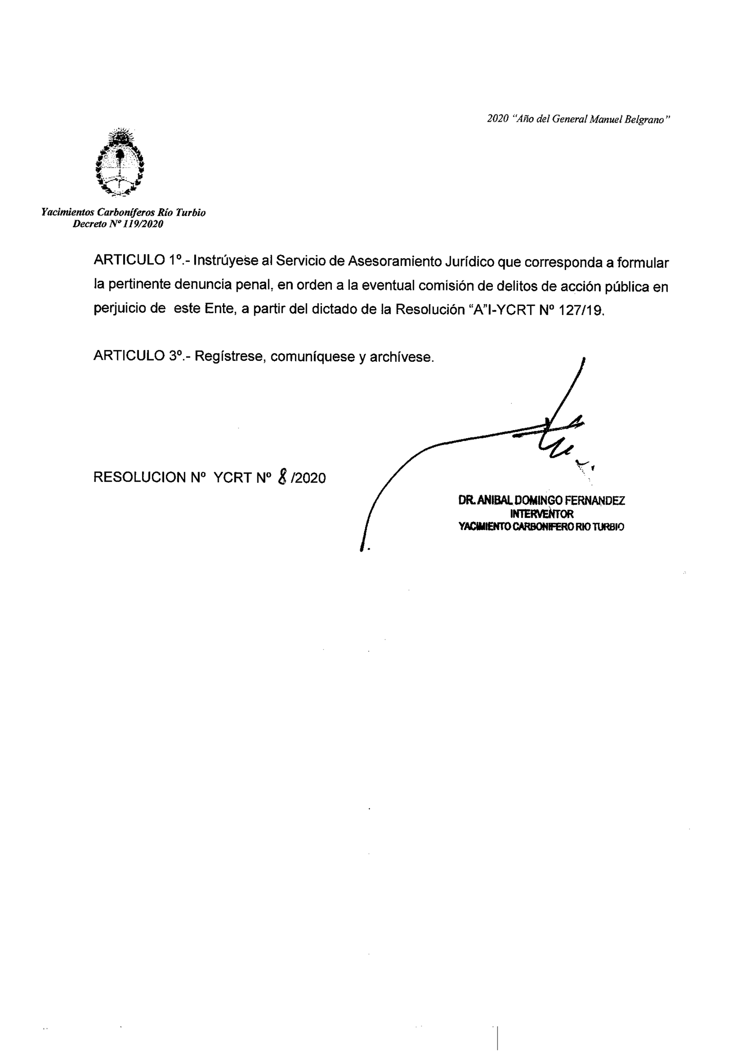 Aníbal Fernández, recientemente designado Interventor de Yacimiento Carbonífero Río Turbio (YCRT), revocó la designación de 417 empleados, quienes habían sido pasados a planta permanente en las postrimerías del gobierno anterior, sin contar con la idoneidad ni la previsión presupuestaria requeridas. También denunció penalmente al interventor de la administración macrista.