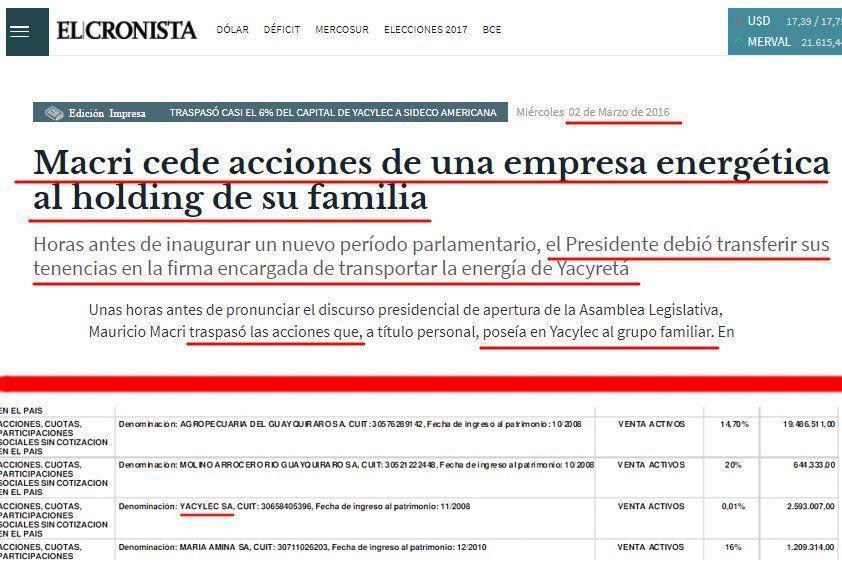 El caso Yacylec también quedó entremezclado con los Panama Papers: «La empresa contaba en su paquete accionario con la empresa SIDECO, de los Macri, desde que ganó la concesión en 1993. Mauricio Macri retuvo incluso acciones en Yacylec a título personal hasta febrero de 2016, luego de los primeros tarifazos que acrecentaron la rentabilidad de la misma, para luego transferir sus acciones (en un supuesto 5,33%, si bien aparecían subvaluadas en declaraciones previas para que aparezcan como un 0,01%) a su propio padre en SIDECO Americana, con sede en Panamá. Macri transfirió sus acciones en febrero de 2016, cuando se supo que se revelarían sus movimientos en los Panama Papers (abril de 2016) y empezaron a conocerse las incompatibilidades entre las empresas de las que era titular y la obra pública del Estado, situación que lo ha venido dejando de ambos lados del mostrador, como en el caso del Correo Argentino, en el que desde el propio Gobierno el ingeniero en funciones intentó licuar la deuda de su familia o el caso del soterramiento del tren Sarmiento en el que se autoasignó financiación millonaria por decreto».