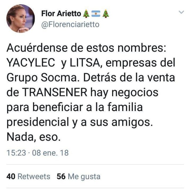 Muchas dudas recaen sobre la empresa Yacylec, que es la encargada de proveer el transporte de energía desde Yacyretá a la estación transformadora de Resistencia, Chaco. Esta empresa es propiedad del Grupo Macri y ya había generado un escándalo cuando se conoció que le debe impuestos a la AFIP por $46 millones de pesos. Recordemos que por acumular deudas millonarias al fisco, empresarios como los dueños del ex Grupo Indalo están presos. El control sobre el Poder Judicial evidentemente hace que solo sean penados los enemigos del Gobierno.