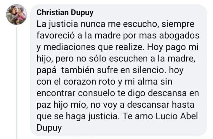 Christian Dupuy, el padre de Lucio, quien fue asesinado anoche a golpes en Santa Rosa, se lamentó que la Justicia nunca le dio la tenencia. “La Justicia nunca me escuchó”, escribió, desde General Pico, donde reside. “Siempre favoreció a la madre por más abogados y mediaciones que realicé. Hoy pagó mi hijo». Y le reclamó a un poder judicial cooptado por la «perspectiva de género»: «no solo escuchen a la madre». “Hoy con el corazón roto y mi alma sin encontrar consuelo te digo descansa en paz hijo mío. No voy a descansar hasta que se haga justicia. Te amo Lucio Abel Dupuy”, finalizó.