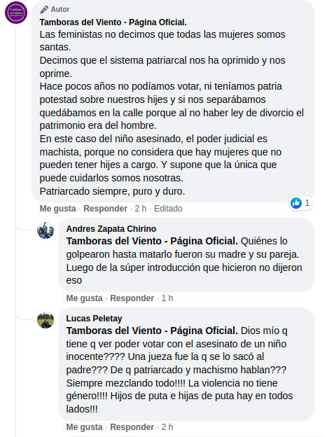 Entre los intereses de Magdalena en sus redes sociales se encontraban también otros exponentes del movimiento, como la «Defensoría de Géneros», la «Feria Feminista» y una agrupación pampeana, «Tamboras del Viento – Agrupación Feminista». Sobre esta última resulta particularmente curioso que se haya manifestado sobre el tema en cuestión, responsabilizando «al patriarcado» (sic) por el asesinato del niño: «En este caso del niño asesinado, el poder judicial es machista, porque no considera que hay mujeres que no pueden tener hijes a cargo. Y supone que la única que puede cuidarlos somos nosotras. Patriarcado siempre, puro y duro».