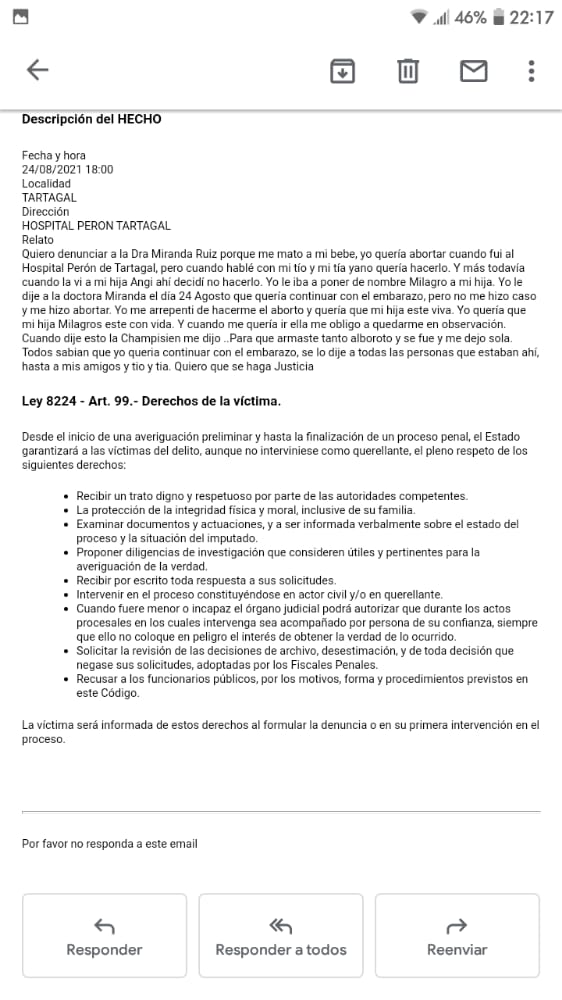 «Como todo aborto el procedimiento seguramente fue cruento, la bebe nació con vida, se tomaron sus huellas plantares y después su madre ya no la escucho, la tía que la acompaño interpuso luego de lo vivido una denuncia penal, esperando que se haga justicia y nunca más vuelva a repetirse un hecho similar», detalló la diputada salteña Cristina Fiore.