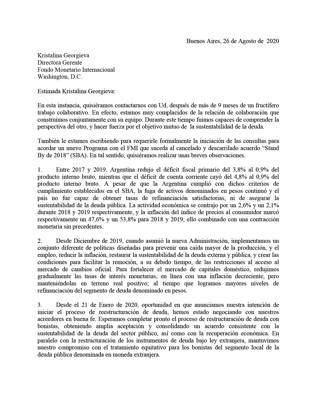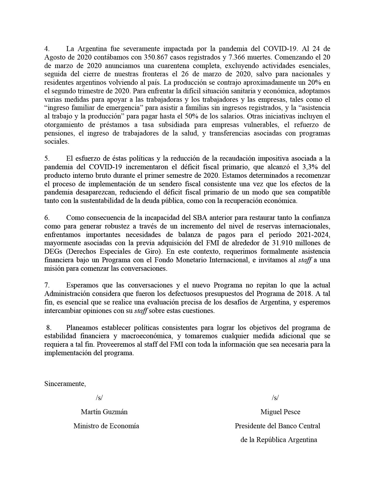 Además, señaló que el Gobierno solicita «formalmente la iniciación de las consultas para acordar un nuevo Programa con el FMI que suceda al cancelado y descarrilado acuerdo ‘Stand By de 2018’“ firmado por la gestión de gobierno de Mauricio Macri, subraya la carta que lleva la firma de Guzmán, Chodos y del presidentes Banco Central, Miguel Pesce.