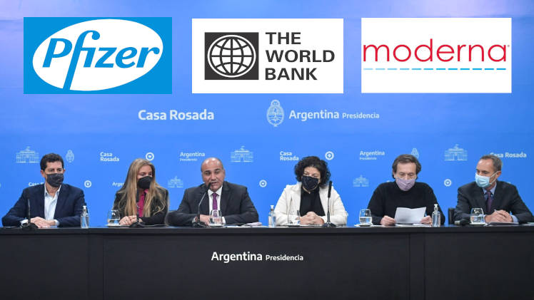 La Argentina se endeudará por U$S 500 millones de dólares con el Banco Mundial para comprar 40 millones de vacunas ARNm en fase III de los laboratorios norteamericanos Pfizer y Moderna contra el Covid-19. El nuevo Jefe de Gabinete de Ministros de la Nación, Juan Manzur, junto a la ministra de Salud, Carla Vizzotti, el secretario de Asuntos Estratégicos, Gustavo Béliz, y el director del Banco Mundial para Argentina, Jordan Schwartz, anunciaron en conferencia de prensa el otorgamiento de un millonario crédito del Banco Mundial, que será destinado a la adquisición de las dosis, de la cuales 20 millones serán de Pfizer-Biontech y 20 millones del laboratorio Moderna. El crédito deberá ser pagado por la Argentina a lo largo de 19 años.