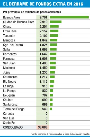 Los fondos entregados a las provincias por la Nación contabilizados hasta mediados de 2016 en los que puede verse cómo Santa Cruz está hacia el final de la tabla, mientras que en segundo lugar se encuentra la CABA, el distrito más rico del país. Fuente: Ambito Financiero.