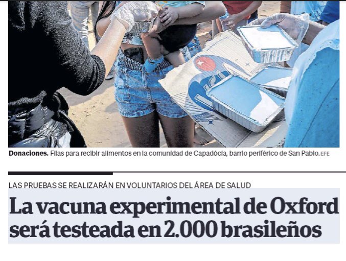 La vacuna de AstraZeneca/Oxford será probada en por lo menos 2000 personas del Brasil. Tras la aprobación de la Agencia Nacional de Vigilancia Sanitaria de Brasil, los test comenzarán a ser realizados en Sao Paulo con un equipo de 1.000 voluntarios.