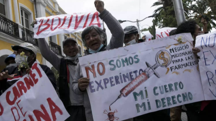 Sindicatos y juntas vecinales anunciaron protestas ante la exigencia de exhibir el certificado en todas las oficinas y centros comerciales y dijeron que la medida no había sido consultada. Representantes de algunas iglesias evangélicas afirmaron que la norma contradice el compromiso inicial del presidente Luis Arce de que la vacuna no sería obligatoria. Los manifestantes bloquearon con piedras una carretera troncal entre las ciudades de La Paz y Oruro; una ruta hacia el santuario de Copacabana, fronterizo con Perú; calles en la ciudad de El Alto, y carreteras en la ciudad de Cochabamba (centro), donde se enfrentaron a los agentes policiales.