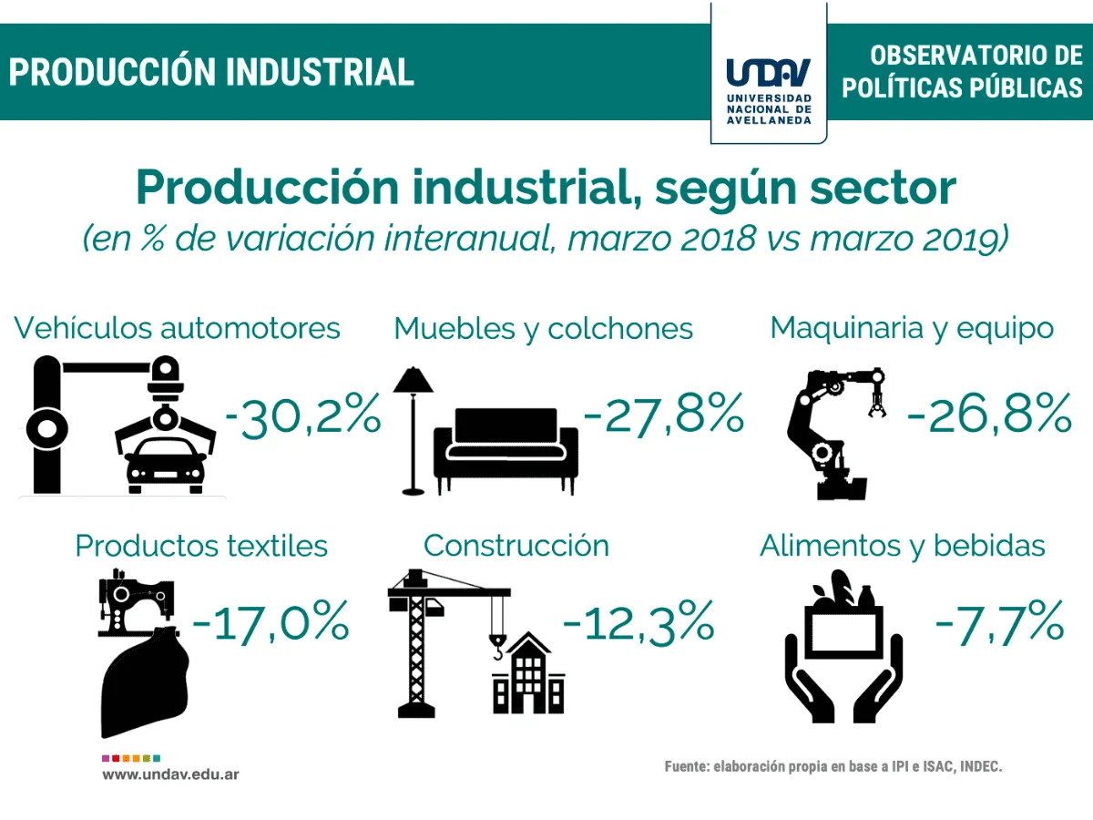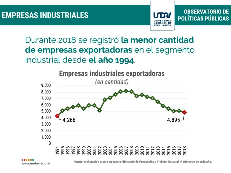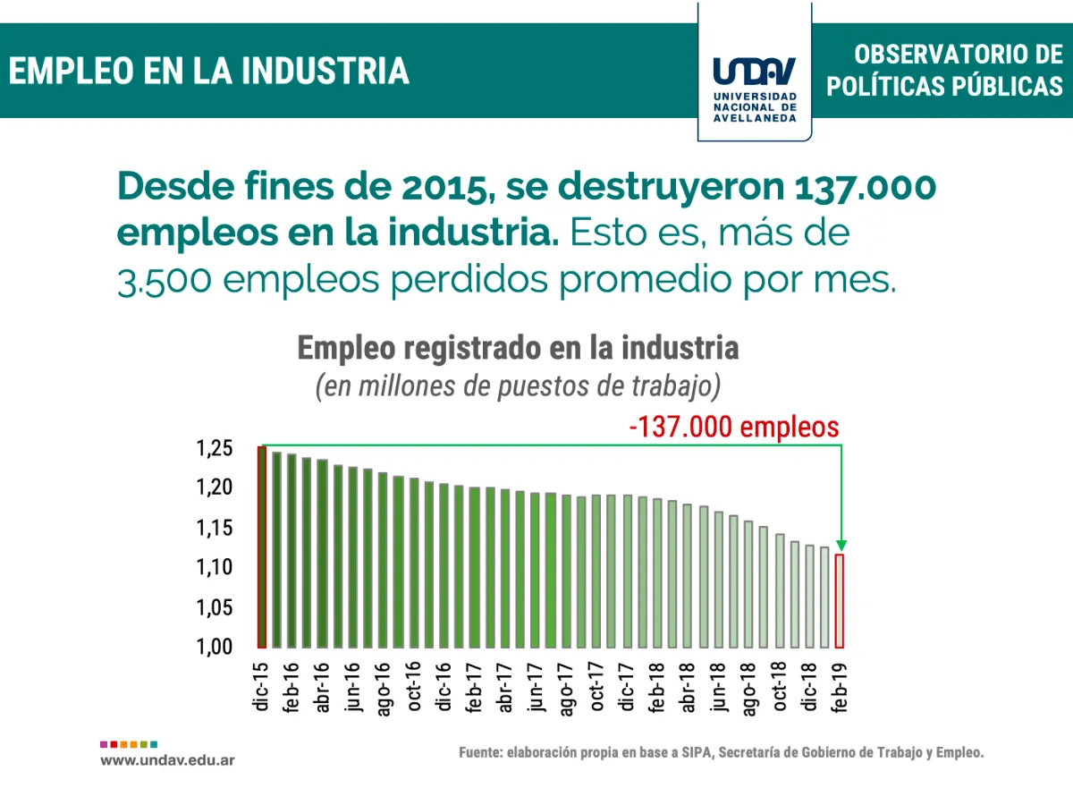 De acuerdo a un informe de la UNDAV (Observatorio de Políticas Públicas de la Universidad Nacional de Avellaneda), el estratégico sector industrial argentino sufrió desde diciembre 2015 a febrero de 2019 la destrucción de 137.000 puestos de trabajo, a razón de 3.500 por mes. La cantidad de empresas industriales exportadoras en 2018 bajó al nivel de las que había en 1994.