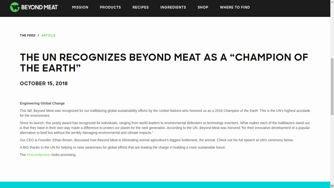 La ONU promueve activamente este tipo de opciones. Beyond Meat fue tempranamente premiada por las Naciones Unidas en 2018, con el reconocimiento «Champion of the Earth» (Campeón de la Tierra).