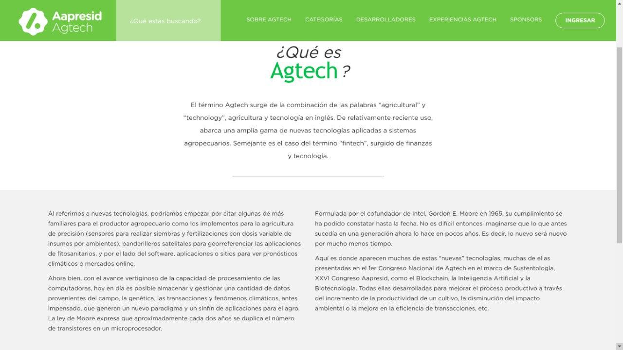 En la Argentina, una institución clave es la Asociación Argentina de Productores en Siembra Directa (Aapresid). Históricamente encargada de promover el paquete de Monsanto (Siembra Directa, fumigaciones con glifosato, semillas transgénicas) ahora también toma la delantera con AgTech: «Con el avance vertiginoso de la capacidad de procesamiento de las computadoras, hoy en día es posible almacenar y gestionar una cantidad de datos provenientes del campo, la genética, las transacciones y fenómenos climáticos, antes impensado, que generan un nuevo paradigma y un sinfín de aplicaciones para el agro (…) Aquí es donde aparecen muchas de estas “nuevas” tecnologías, muchas de ellas presentadas en el 1er Congreso Nacional de Agtech en el marco de Sustentología, XXVI Congreso Aapresid, como el Blockchain, la Inteligencia Artificial y la Biotecnología«.