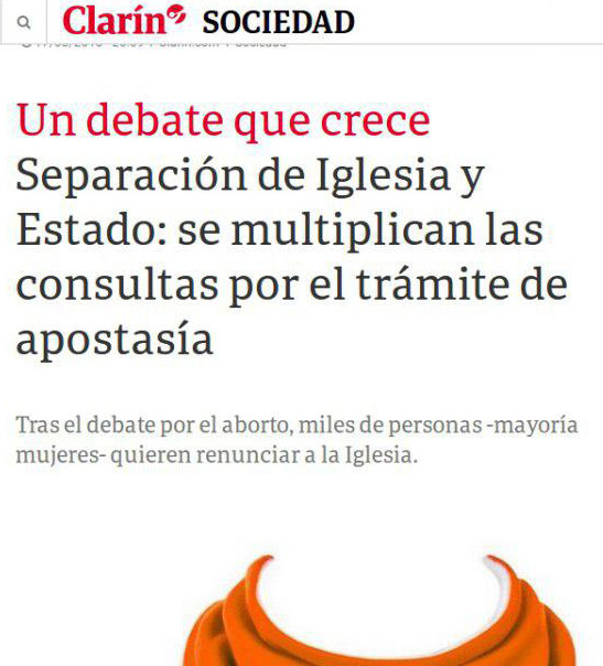 Una pequeña mesa con unas pocas decenas de personas firmando las planillas de «apostasía colectiva», fue amplificada por Clarín como parte de una importante movilización, interesante en un diario del poder que se destaca por ocultar manifestaciones de cientos de miles de personas. El diario no solo le da un enorme espacio elogioso a la iniciativa sino que a manera de invitación ofrece todos los datos para los que quieran participar de la misma.