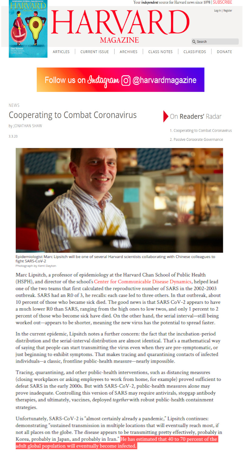 Marc Lipsitch: el coronavirus (SARS-CoV-2 / COVID19) alcanzará entre el 40% y el 70% de la población global.