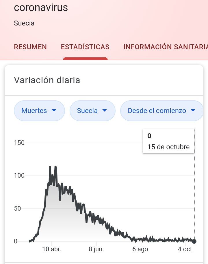 Suecia pudo lograr de esa forma una curva de mortalidad decreciente, si bien actualmente registra a nivel de casos (junto a aumento de testeos) una «segunda oleada» en ciudades grandes, como Estocolmo, pero sin crecimiento fuerte de defunciones: