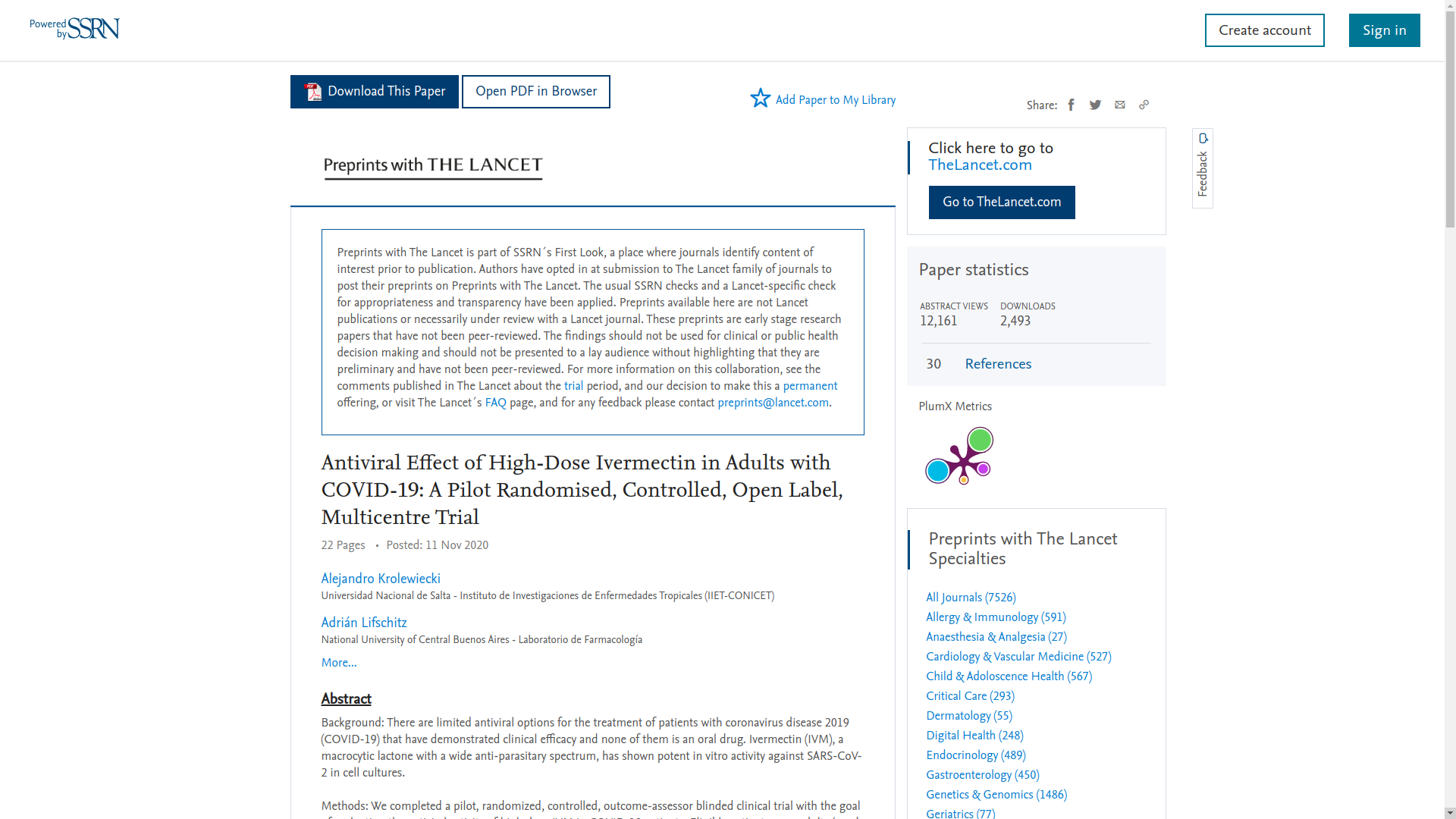 La ivermectina es una droga antiparasitaria de amplio uso en la medicina y la veterinaria, desde hace muchos años. El médico Alejandro Krolewiecki, del Instituto de Investigaciones de Enfermedades Tropicales de la Sede regional Orán de la Universidad Nacional de Salta (UNSA), realizó un estudio para comprobar su eficacia contra el Covid-19. La pre-publicación en The Lancet, del 11 de noviembre, «El efecto antiviral de la ivermectina en dosis altas en adultos con covid-19»: un ensayo piloto aleatorizado, controlado, abierto y multicéntrico, muestra la experiencia de 4 centros de salud de Argentina con la ivermectina, en el contexto de un ensayo clínico controlado aleatorizado y cegado, que parece ser el primero en publicar sus datos.