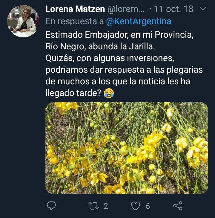 También aparece en Twitter sumándose a un chiste sobre la calvicie del embajador británico, congraciándose así con el representante del gobierno que usurpa nuestras Islas Malvinas, Mark Kent: