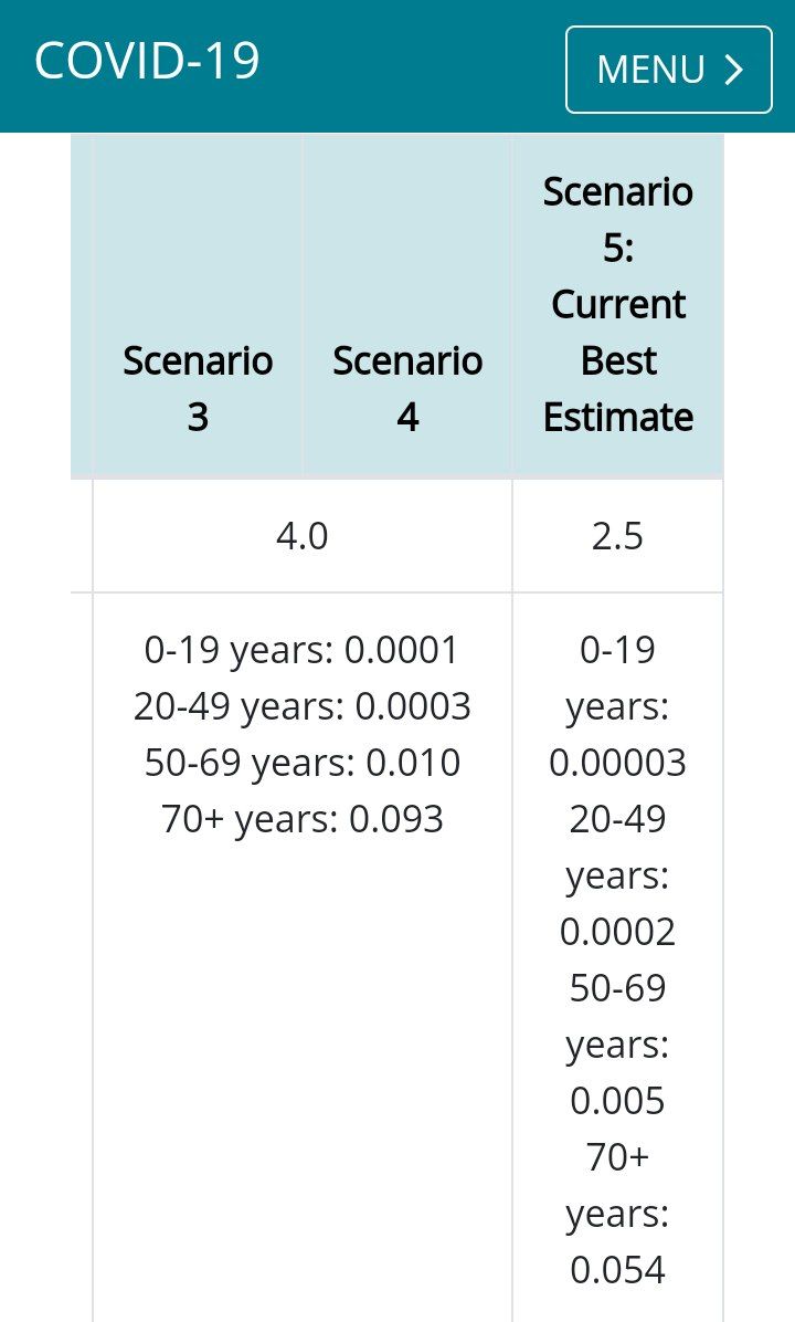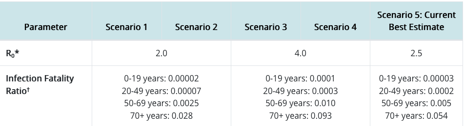 La «mejor estimación» («best estimate») de los CDC puede estar equivocada y ofreció otros escenarios, que también se muestran en el cuadro a continuación. Sin embargo, todos son muy bajos, como puede ver. Para los que tienen entre 20 y 49 años, por ejemplo, incluso en el peor de los casos, el IFR es solo de 0,0003. Eso significa que sus posibilidades de morir incluso si se infectara serían de 1 entre 3333.