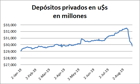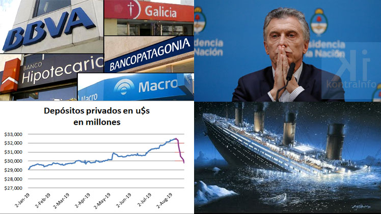 La fuga de capitales no se detiene. De los U$S 44.500 millones de dólares que le prestó el Fondo Monetario Internacional a la Argentina, la mayor parte ya se fugó. Entre junio de 2018 y julio de 2019 se fueron del sistema bancario argentino U$S 27.500 millones. A pesar del enorme monto del préstamo, la economía cayó un 1,7%, la inflación supera el 50% y la desocupación se incrementó al 10%. El FMI debería desembolsar el 14 de septiembre unos U$S 5500 millones, pero actualmente esto es algo que está en duda. ¿Qué pasará si el FMI decide no enviar ese dinero, como hizo en el último tramo del gobierno de Fernando De la Rúa? El Titanic se sigue aproximando al iceberg.