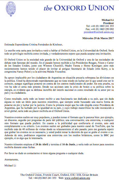 La ex mandataria finalizará su gira en Londres donde fue invitada por The Oxford Union para brindar una conferencia en la Universidad de Oxford.