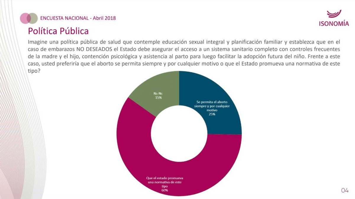 Frente a este caso, ¿usted preferiría que el aborto se permita siempre y por cualquier motivo o que el Estado promueva una normativa de este tipo?», el 60% de los argentinos se manifestaba en contra de permitir el aborto «como un derecho» o sea, por cualquier motivo y apoyaba esta propuesta hipotética de un Estado presente acompañando a la madre embarazada. Solo un 25% entiende al aborto «como un derecho» a sola petición y sin causales.
