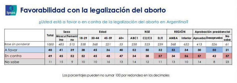 De acuerdo a una encuesta nacional realizada por la consultora Ipsos a mediados del mes de junio, el 49% de los entrevistados en la Argentina se manifestó en contra de legalizar el aborto y solo un 40% se expresó a favor (11% no se expresó ni por una ni por otra opción).