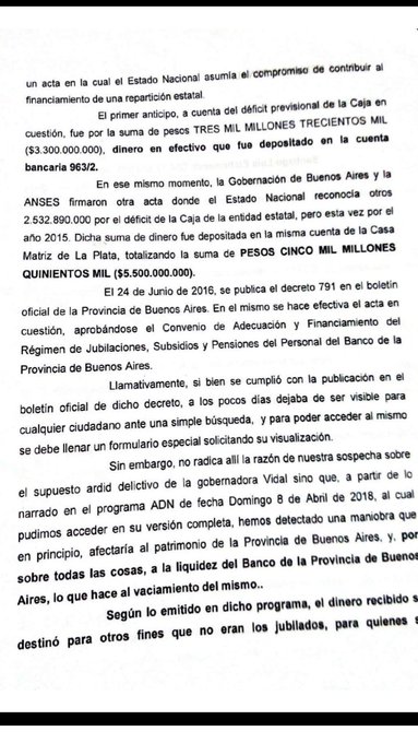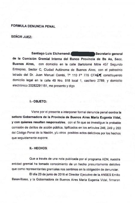 El denunciante es el secretario general de la Comisión Gremial Interna del Banco Provincia (CGI-Bapro), Santiago Etchemendi. De acuerdo al gremio, varios juzgados fueron rechazando hacerse cargo de la denuncia, la que originalmente fue parte de una investigación del programa ADN de abril de 2018. «Arrancamos el camino el 6 de noviembre de 2018 y vamos por el cuarto juzgado, se declaran incompetentes, ahora está en la UFI 16 de la provincia de Buenos Aires. Los jueces se declaran incompetentes pero ningún juez la desestima porque tendría que explicar por qué no está la plata en el Banco Provincia, somos empleados del banco y sabemos que no llegó a ese lugar y hoy falta dinero que necesita la provincia», sostuvo Etchemendi a FM En Tránsito. La causa actualmente está en el juzgado de garantías de La Plata, a cargo de Jorge Moya Panisello.