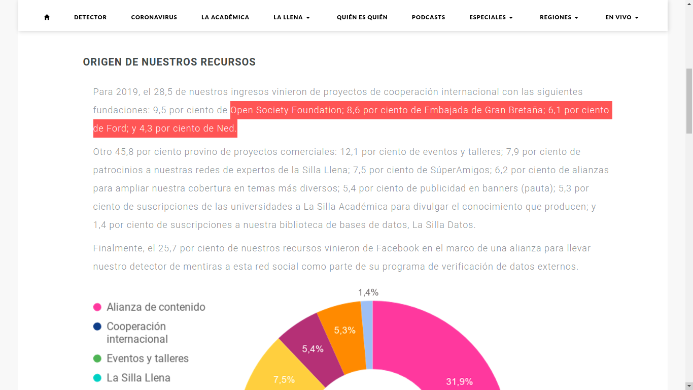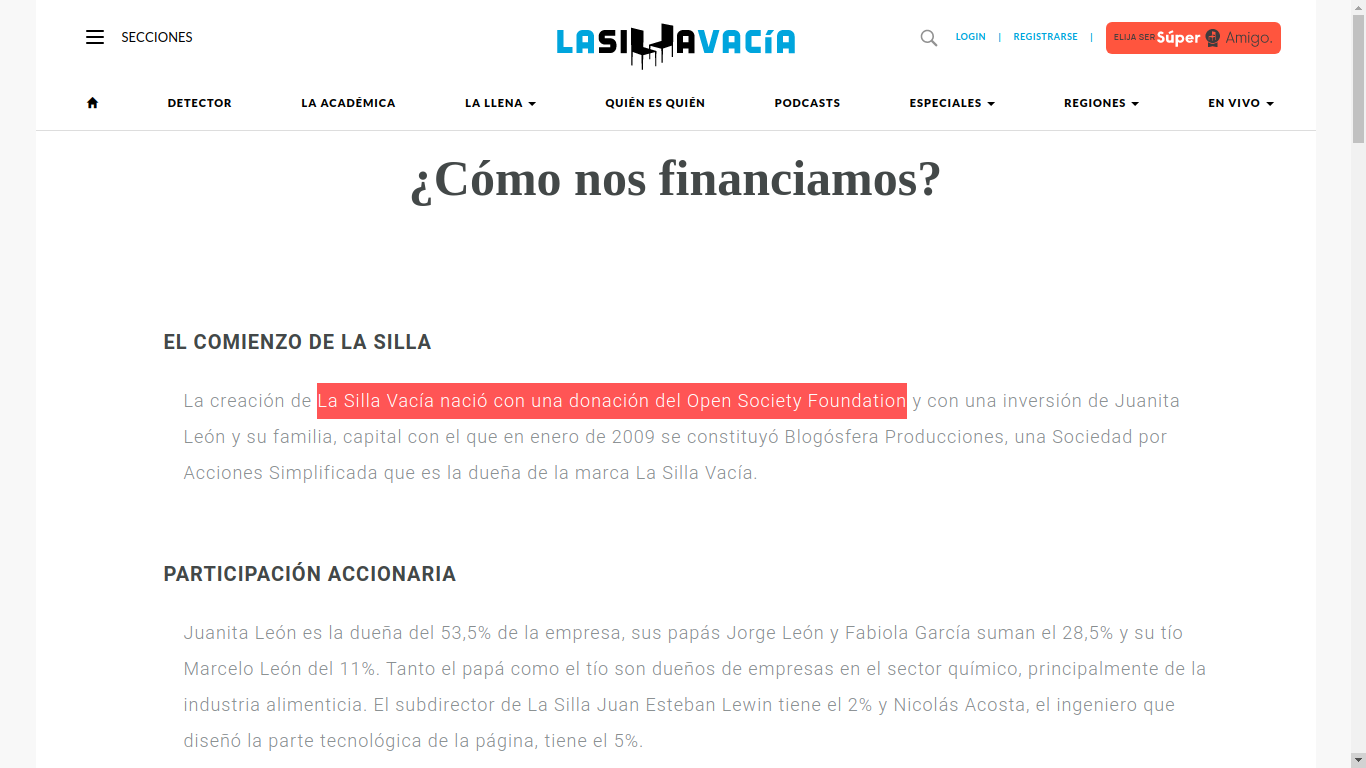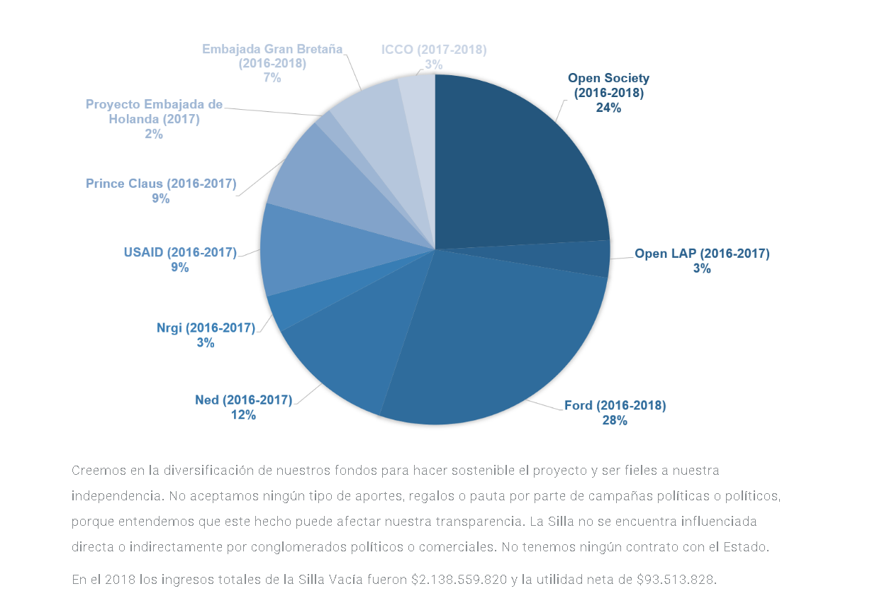 Asimismo, el sitio web de La Silla Vacía ofrece abiertamente la información sobre sus patrocinadores extranjeros, entre los cuales se encuentran la Agencia de EE.UU. para el Desarrollo Internacional (USAID), la Fundación Ford, la Open Society Foundation, la Embajada de los Países Bajos y la Embajada del Reino Unido.
