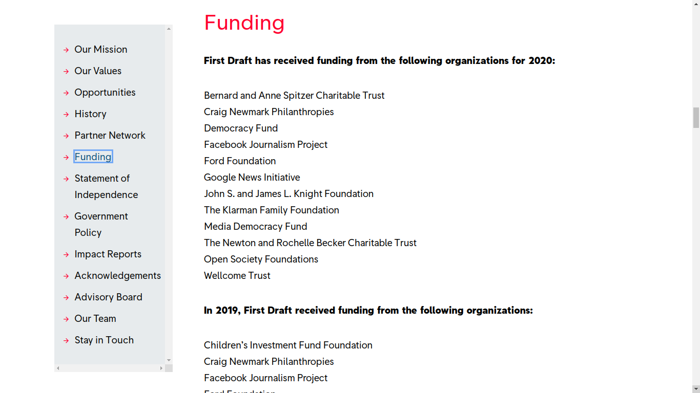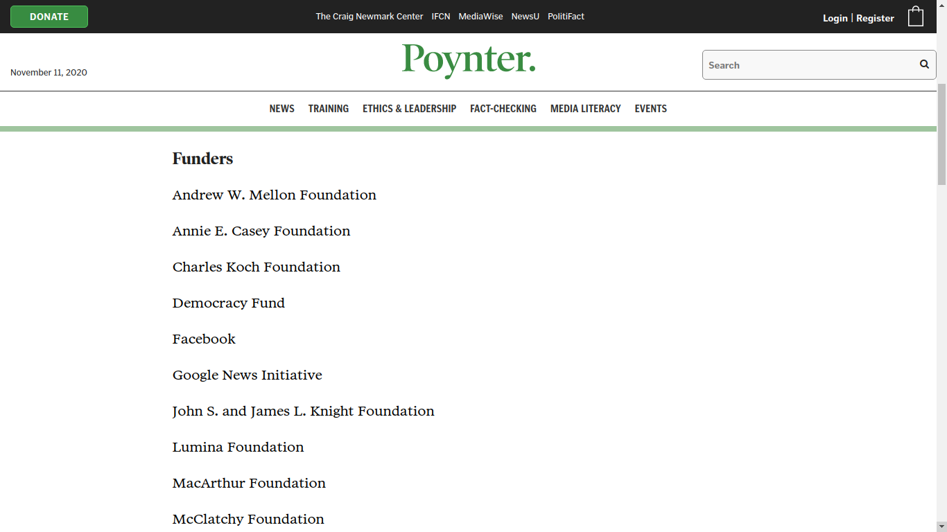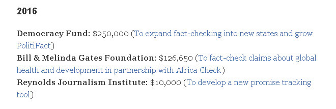 En EE.UU., una de las entidades que lucha contra las ‘fake news’ en Facebook es la plataforma Politifact, perteneciente al propio Instituto Poynter y financiada, entre otras fuentes, desde el conglomerado de medios estadounidense The E.W. Scripps Company, la Fundación Ford, Democracy Fund (de la red de Pierre Omidyar) y Knight Foundation, que organiza programas educativos para periodistas.