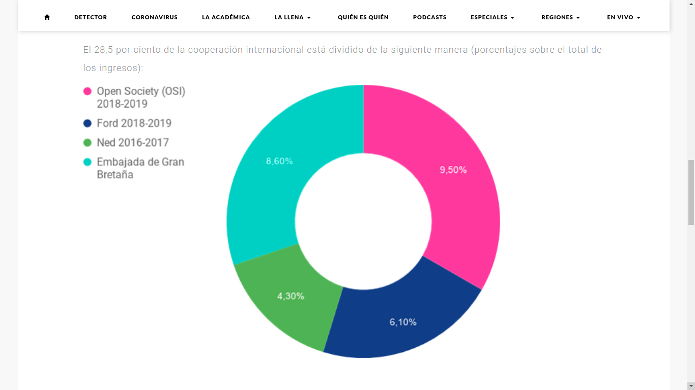 «Para 2018, el 35 % de nuestros recursos vinieron de proyectos de cooperación internacional con las siguientes fundaciones: 14 % de Open Society, 9 % de Embajada de Gran Bretaña, 4 % de Ford, 4 % de Ned, 1 % de Nrgi, 1 % de Prince Claus (premio) y 1 % de USAID», detallan.