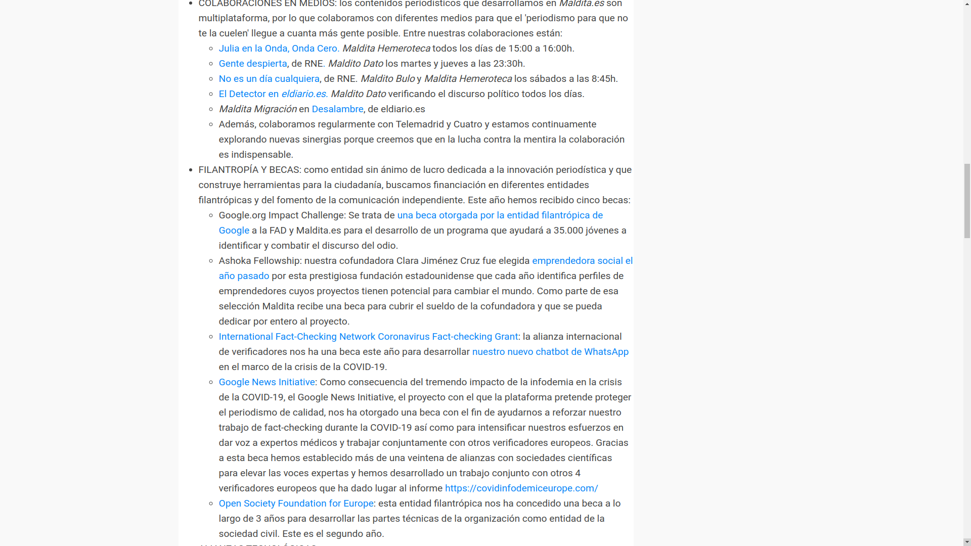En España, la situación se repite con Maldito Bulo /Maldita.es que recibe aportes de la Open Society, Google y la International Fact Checking Network: