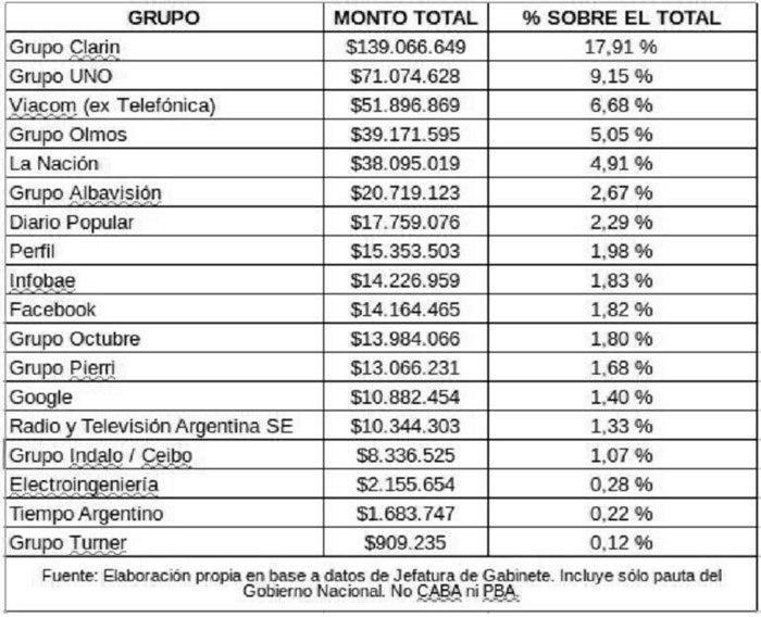 En el siguiente cuadro, elaborado por el periodista Ari Lijalad en base a datos provistos por la Jefatura de Gabinete, puede observarse la desmesura en el reparto de la pauta oficial, premiando a los medios cómplices y castigando a los que menos se alinean: