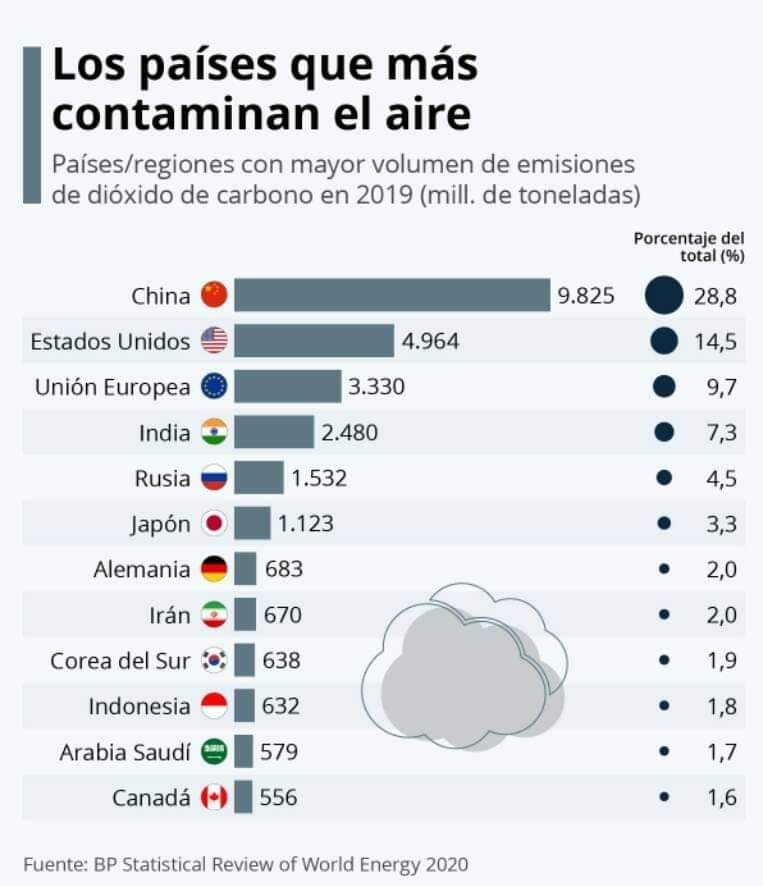 Los principales emisores de CO2 en el mundo casualmente son las dos principales potencias del planeta, China con un 28% de emisiones y Estados Unidos con un 14%, seguidos por India con un 7% o la Unión Europea, si la tomamos sin distinción de naciones, casi con un 10%, a su vez Alemania emite un 2%. Es decir, en el podio los países que lograron su desarrollo mediante el usó de energías fósiles como el carbón (China) y petróleo-gas (EE.UU). Entre los primeros 3 países superan el 50% de emisión de gases CO2. (1)