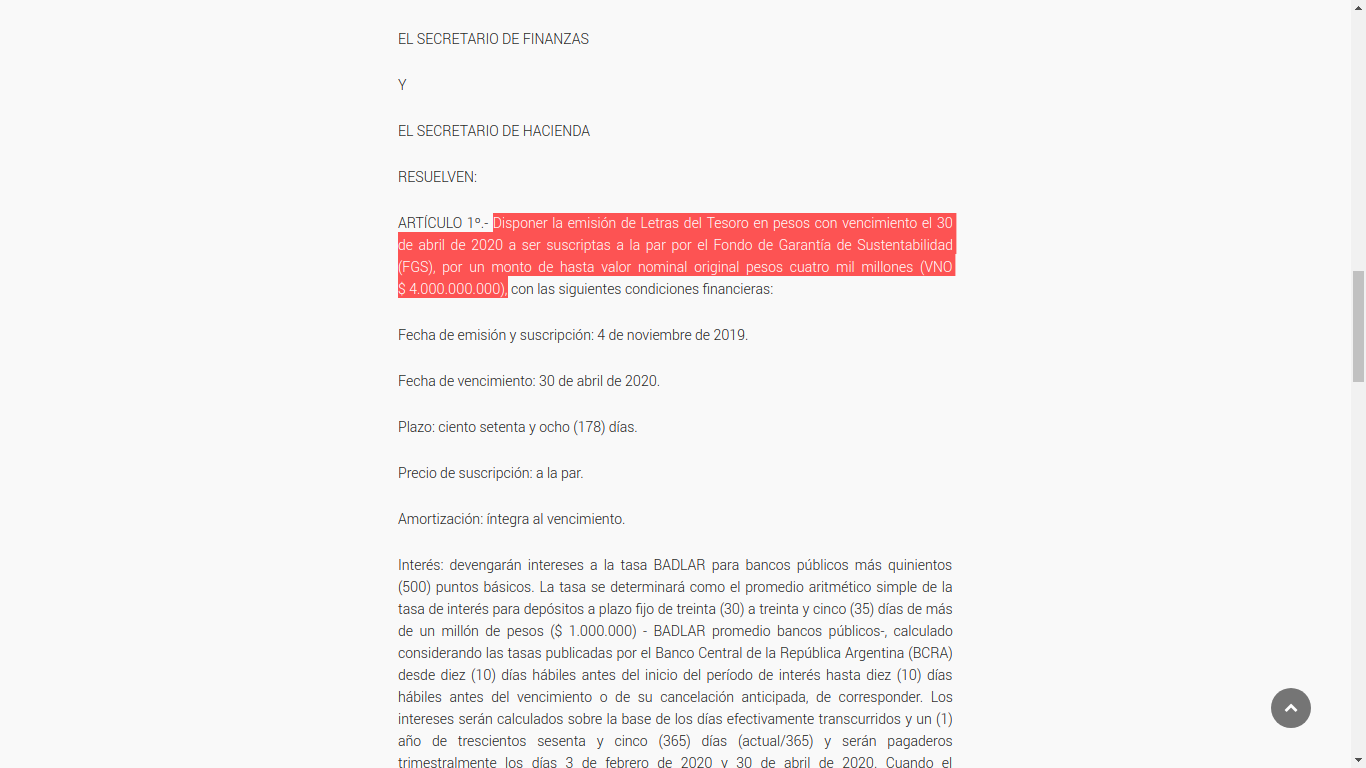 Mediante la resolución 72/2019, publicada en el Boletín Oficial, la ANSES suscribirá Letras del Tesoro por $4000 millones de pesos y U$S 120 millones de dólares (unos $7.600 millones de pesos al tipo de cambio actual), con vencimiento el 30 de abril de 2020, por lo que estos montos deberán ser devueltos por el próximo gobierno.