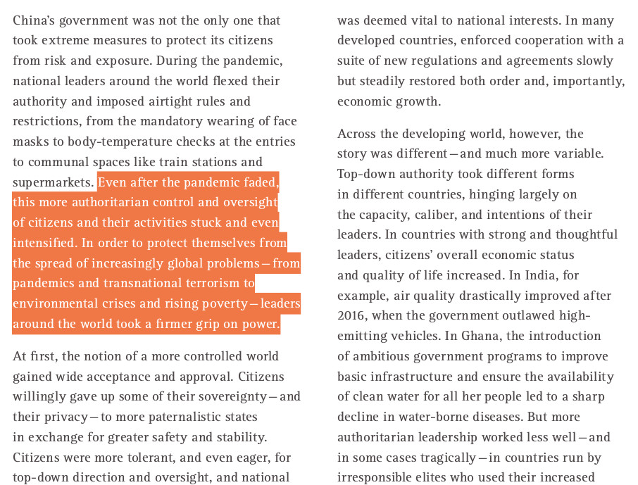 se intensificaron».«Para protegerse de la propagación de problemas cada vez más globales, desde pandemias a terrorismo transnacional, para crisis ambientales y aumento de la pobreza, los líderes en todo el mundo tuvieron un control más firme sobre el poder».