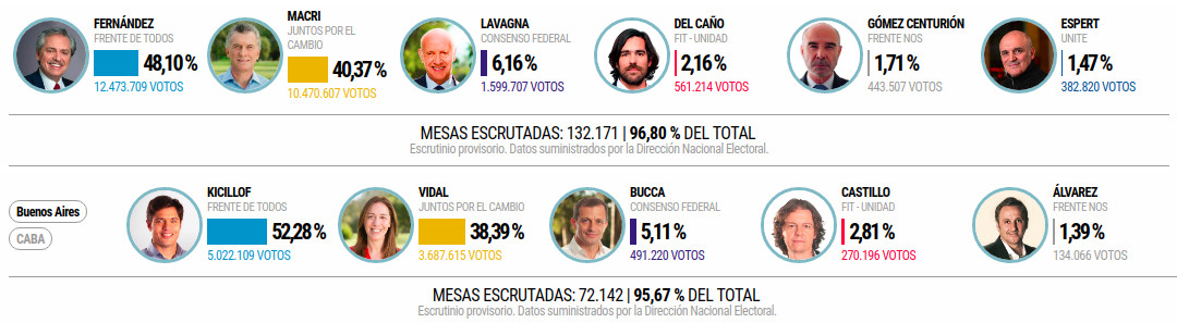 Tras casi 4 años de un saqueo sistemático, una destrucción planificada del tejido productivo industrial y la generación de 5 millones de nuevos pobres, el pueblo argentino aplastó al gobierno de Mauricio Macri en las urnas. La fórmula de Alberto Fernández y Cristina Fernández de Kirchner canalizó el profundo descontento, obtuvo más de 12 millones de votos (48%) y derrotó en primera vuelta al marketing y el falaz recurso al vacío discurso republicanista de Juntos para el Cambio, que logró un no despreciable 40 % con 10 millones de votantes.