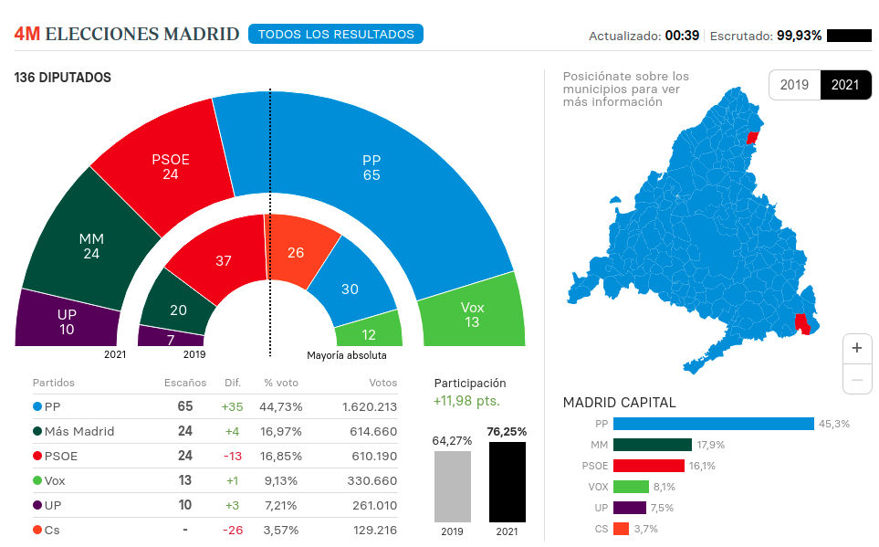 La elección de Madrid, con el triunfo de Isabel Díaz Ayuso, quien preside la Comunidad capitalina, sepultó el proyecto polìtico de Pablo Iglesias (Unidas Podemos) y puso un límite al gobierno socialdemócrata de Pedro Sánchez. Ayuso dobló el número de escaños que tenía, pasando de 30 a 65 y superó sola a toda la izquierda, siendo en buena parte su voto un mensaje de castigo a Sánchez, su manejo de la economía y la pandemia. El progresismo liberal del PSOE quedó tercero peleando el segundo lugar con la agrupación de solo dos años de existencia, «Más Madrid».
