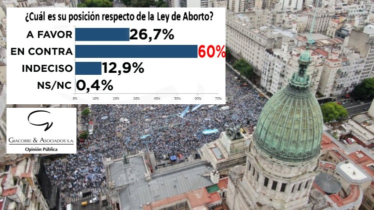 A medida que avanzan los debates en la sociedad, también avanza el rechazo hacia el proyecto de Ley de legalización del aborto que se debate en el Congreso Nacional. Así lo revela una última encuesta realizada, a nivel nacional, por la consultora Giacobbe y Asociados. El resultado es contundente: rechaza la legalización del aborto el 60% de los argentinos y solo quiere que el proyecto se apruebe un 26,7%.