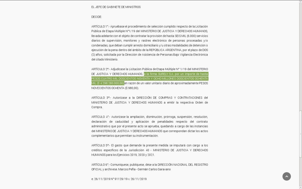-28 de febrero de 2018: Expediente EX-2017-08246679 de Nación por «supervisión, rastreo y monitoreo electrónico de personas procesadas y/o condenadas», otorgando a Surely S.A. $310.104.000 de pesos por 876.000 servicios.