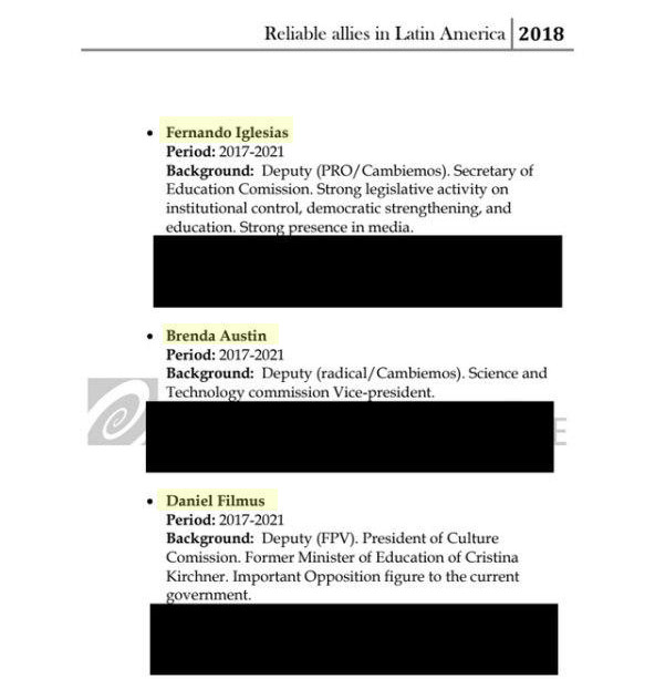 Son presentados como «reliable allies in Latin America» o sea, «aliados confiables en América Latina» de la Open Society de Soros y clasificados como «Trustable leaders for OSF & OSI LR1» o sea «líderes confiables para la Open Society Foundations», siendo LR1 «referentes argentinos comprometidos con los valores de la Open Society Foundations y dispuestos a colaborar en el desarrollo legislativo y nueva normativa».