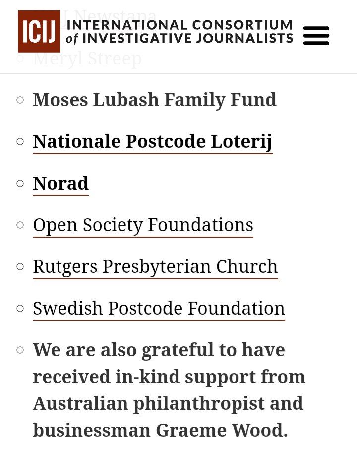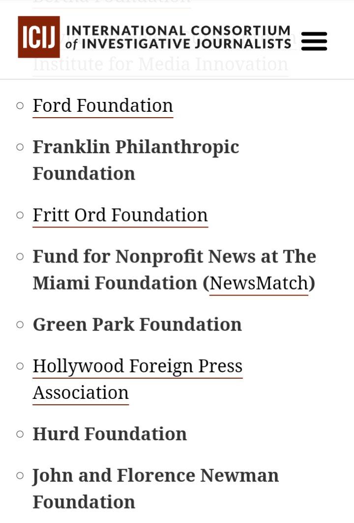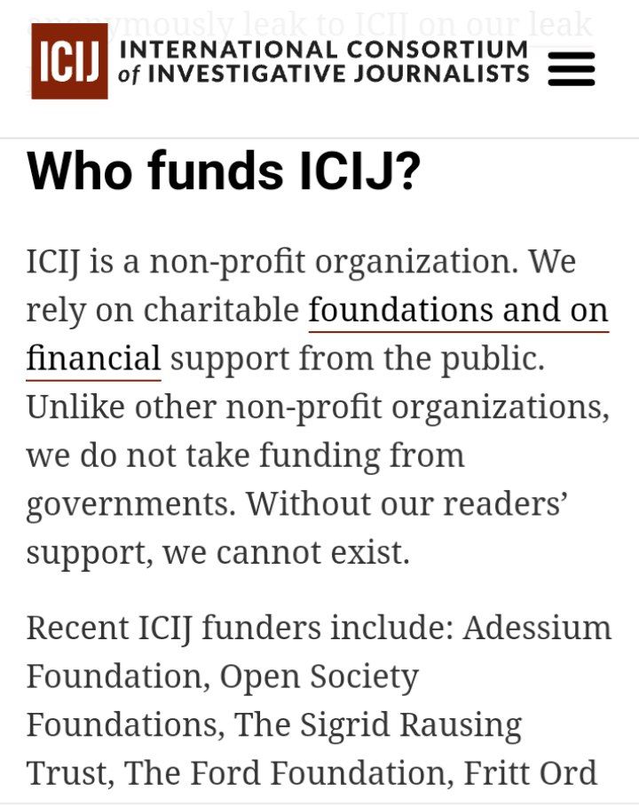 El ICIJ tampoco es una mera «asociación de periodistas independientes» como se presenta (en Argentina, los «elegidos» son periodistas de Infobae, Perfil y La Nación). Entre las entidades que la financian están presentes la Ford Foundation, ligada históricamente a la CIA y la Open Society Foundations del magnate y megaespeculador financiero, George Soros.
