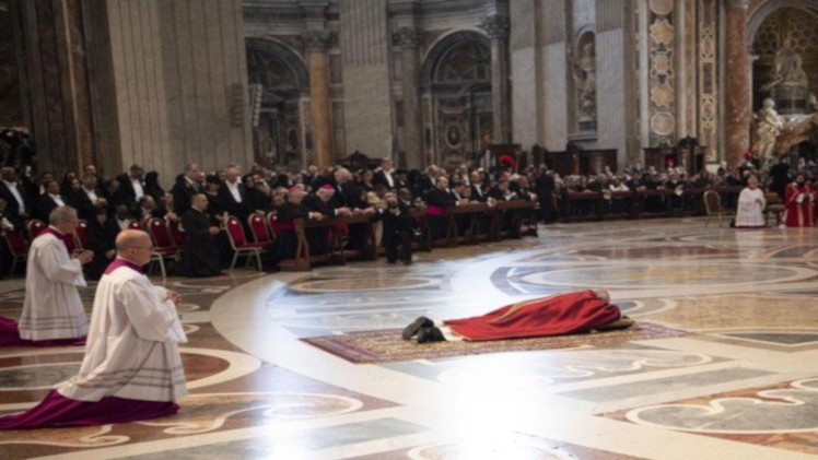 Antes del Vía Crucis, Francisco presidió la celebración de la Pasión del Señor en la Basílica de San Pedro en donde se postró en el suelo delante del altar para orar durante unos minutos.