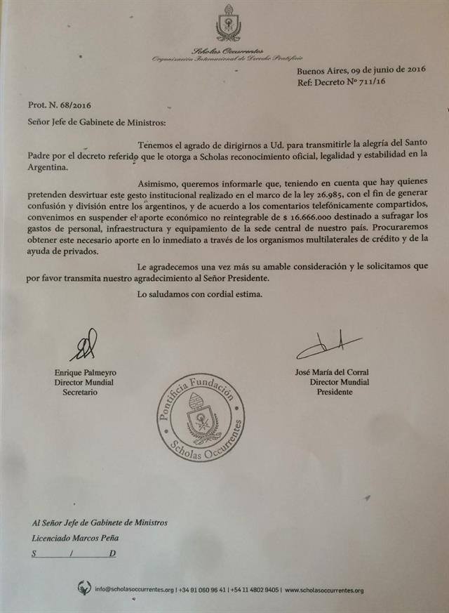 El Papa Francisco rechazó los $16,666 millones que le donó el gobierno de Macri a la Fundación Scholas Ocurrentes. «El Gobierno argentino tiene que acudir a tantas necesidades del pueblo, que no tienen derecho a pedirle un centavo», dice el comunicado. Según la periodista Elisabetta Piqué de La Nación, la medida causó «sorpresa y malestar en la Casa Rosada».