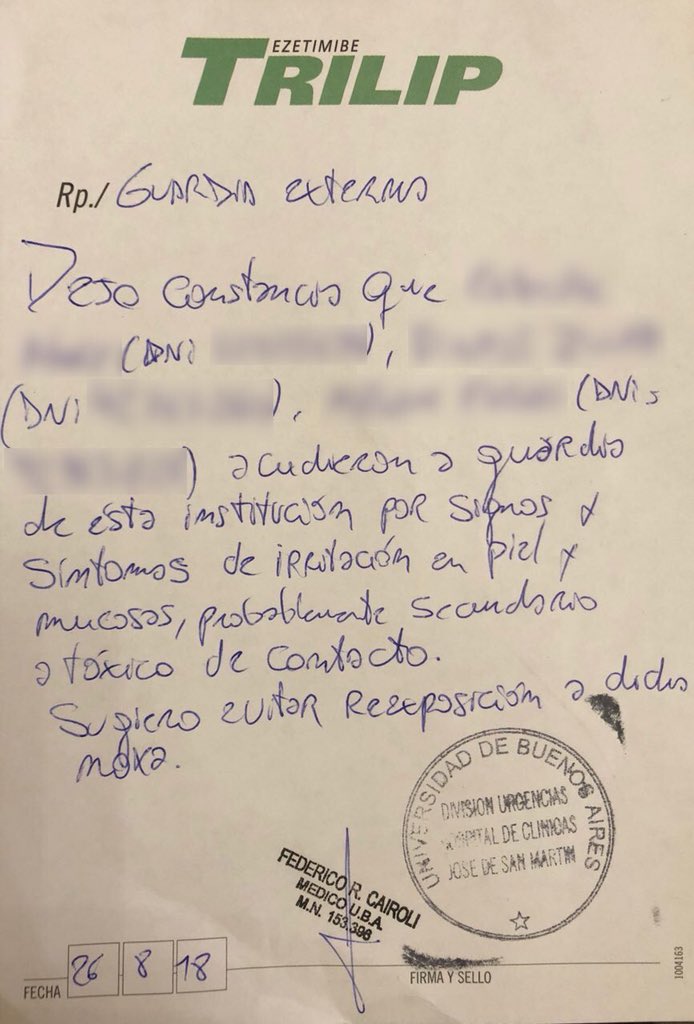 6. Además, un hecho de extraordinaria gravedad acaba de ocurrir en el domicilio de la calle Uruguay. Quien se dedica habitualmente de las tareas del hogar en ese domicilio, ingresó al mismo el día sábado 25 de agosto de 2018 por primera vez después que se practicara el allanamiento. Dado que el trabajo de limpieza requería una mayor profundidad, le solicitó a dos miembros de su familia que la ayudaran. Una vez en el interior del departamento, cuando estaban ordenando la ropa y limpiando los estantes en el vestidor del dormitorio de mi representada, sintieron mareos, fuerte picazón en la garganta y los ojos y dificultades para respirar. Como tales síntomas persistieron durante el resto del día, el domingo 26 de agosto próximo pasado concurrieron a la guardia del Hospital de Clínicas. Luego de efectuarse los controles médicos de rigor, se constató que las dolencias padecidas tienen como origen un tóxico de contacto, recomendándose evitar, por todos los medios, una nueva re exposición al mismo ambiente. Por esa razón mi representada decidió no regresar a ese departamento hasta tanto no se tenga una certera evaluación sobre el lugar y las cosas que fueron objeto de manipulación durante el allanamiento.