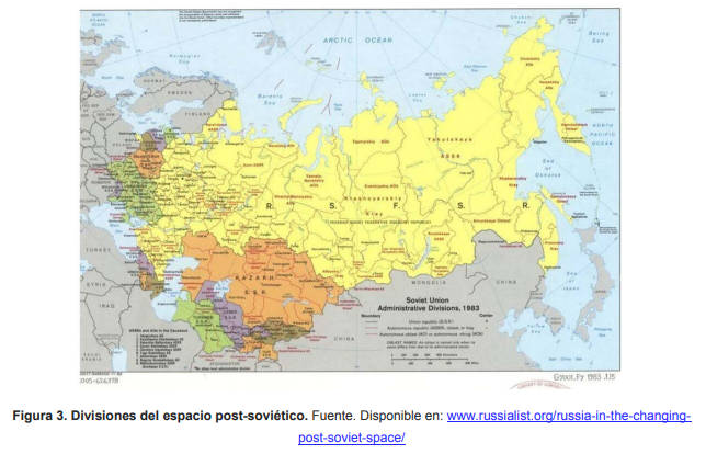 imagen adjunta, en amarillo Rusia; en colores distintos al gris el resto de Repúblicas soviéticas— se le suma la visión panrusa del denominado «mundo ruso»(24) que incluye no solo a las zonas donde existen minorías o grupos «de rusos», sino incluso a entornos simpatizantes con Rusia.