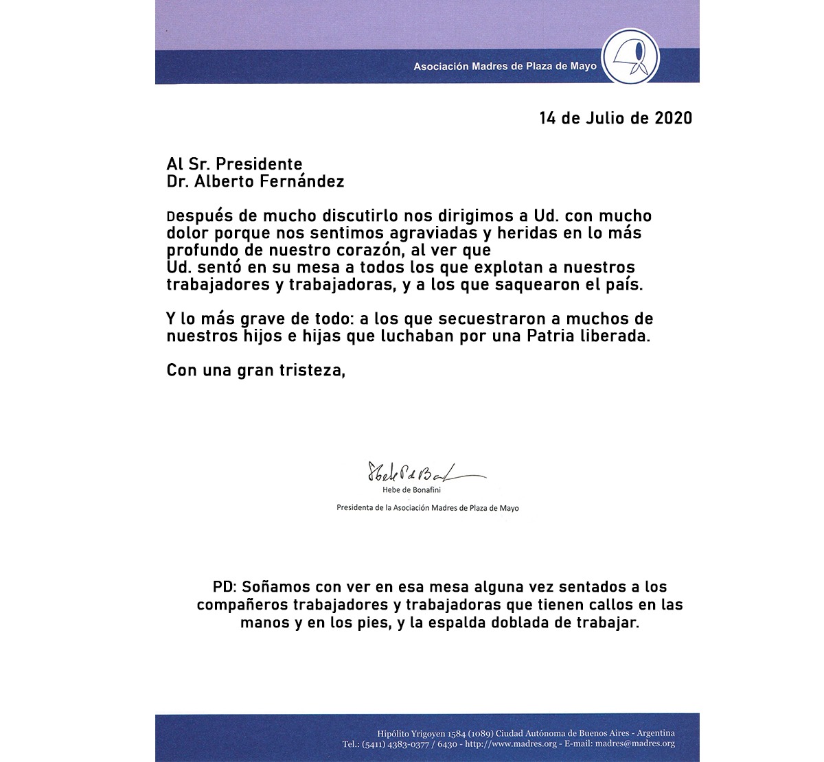 Hebe de Bonafini, titular de Madres de Plaza de Mayo, difundió hoy una dura carta dirigida al presidente Alberto Fernández, cuestionando la decisión de convocar a representantes de sectores como la Sociedad Rural Argentina, con cuyo presidente, Daniel Pelegrina, el mandatario nacional se mostró en la última celebración del acto del 9 de Julio, una imagen que ya se había dado el 4 de mayo pasado y que recuerda a su vez la del almuerzo de AEA (Asociación Empresaria Argentina) en donde se pudo ver a un Héctor Magnetto sonriente.