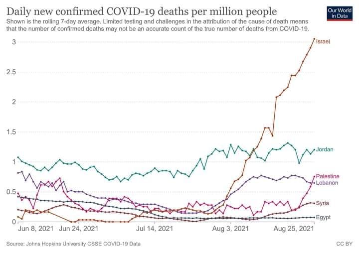 También se presenta la paradoja, en la comparación con los países vecinos, de contar Israel con mayor cantidad de muertes por millón.