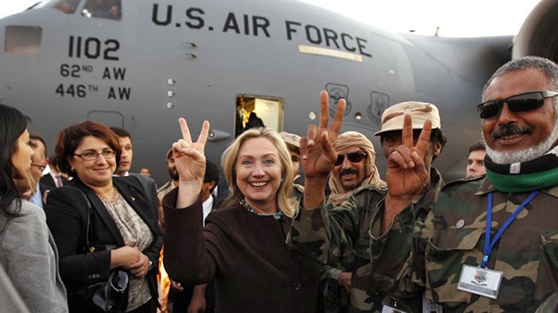 Estados Unidos, como parte de una operación de la OTAN, brindó apoyo aéreo en una intervención que resultó en el derrocamiento del antiguo gobernante del país, Gadafy, de quien Obama dijo que estaba lanzando acciones militares que estaban causando muertes de civiles. Con dicha excusa, el ejército de Estados Unidos gastó varios miles millones de dólares y estuvo varios meses respaldando el levantamiento libio contra Gadafy. El levantamiento, parte de una «revolución de color», derrocó a Gadafy en agosto de 2011 y las «fuerzas rebeldes», apoyadas por EEUU, lo asesinaron en octubre.