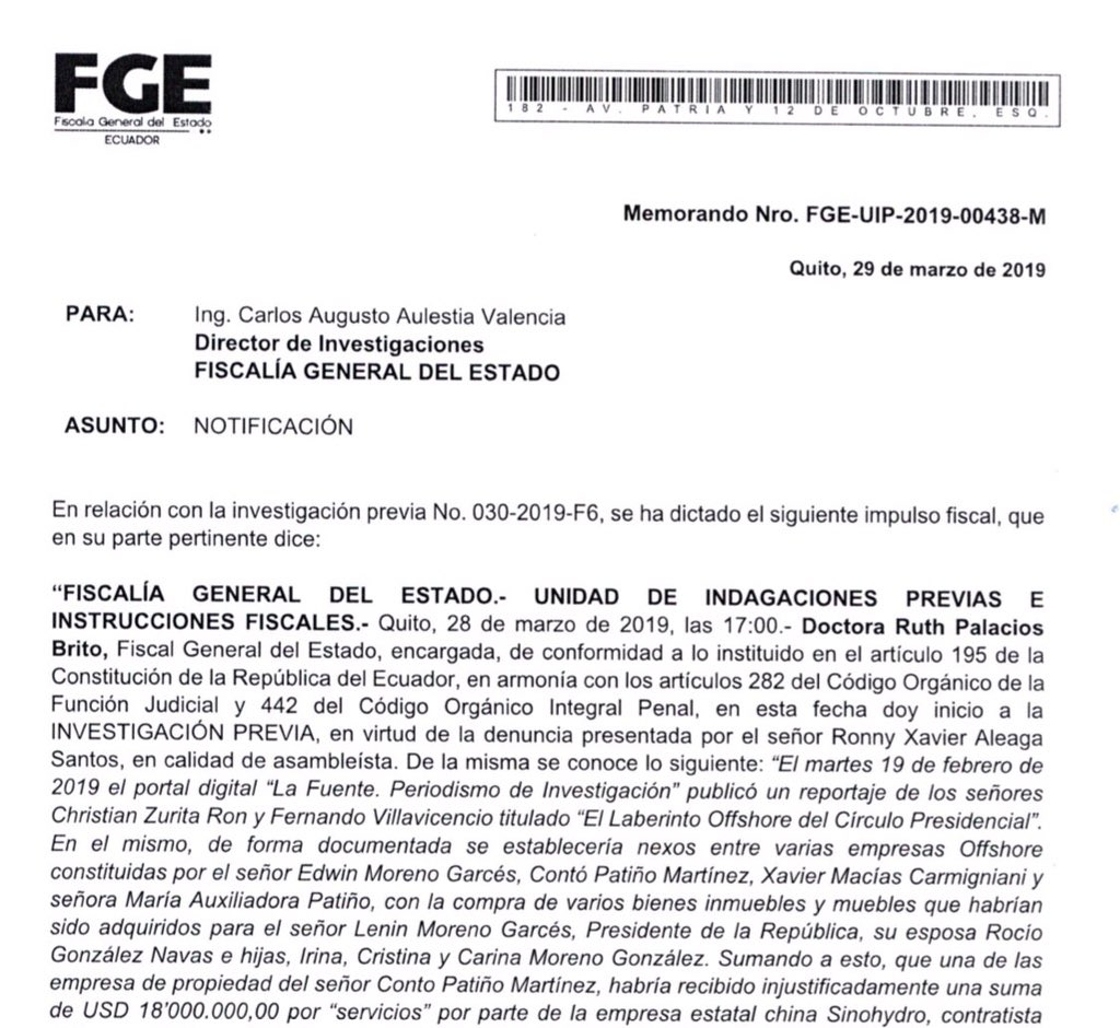 En la denuncia se afirma que «el martes 19 de febrero de 2019 el portal digital ‘La Fuente. Periodismo de Investigación’ publicó un reportaje de los señores Christian Zurita Ron y Fernando Villavicencio titulado ‘El Laberinto Offshore del Círculo Presidencial’. En el mismo, de forma documentada, se establecerían nexos entre varias empresas offshore constituidas por el señor Edwin Moreno Garcés, Conto Patiño Martínez, Xavier Macías Carmigniani y la señora María Auxiliadora Patiño, con la compra de varios bienes inmuebles y muebles que habrían sido adquiridos para el señor Lenin Moreno Garcés, Presidente de la República, su esposa, Rocío González Navas e hijas, Irina, Cristina y Carina Moreno González. Sumando a esto, que una de las empresas de propiedad del señor Conto Patiño Martínez, habría recibido injustificadamente una suma de U$S 18.000.000 por ‘servicios’ por parte de la empresa estatal china Sinohydro, contratista del Estado».