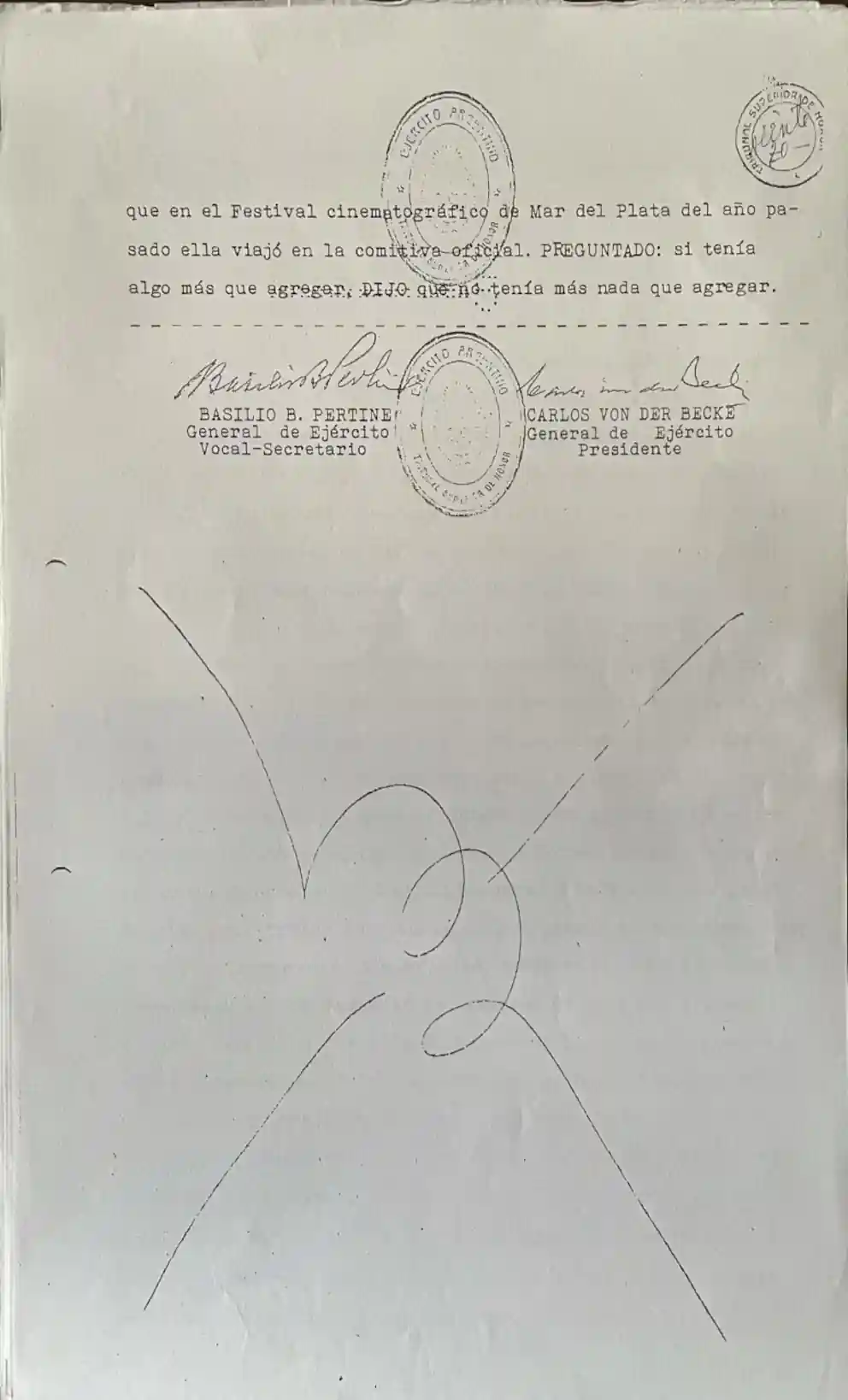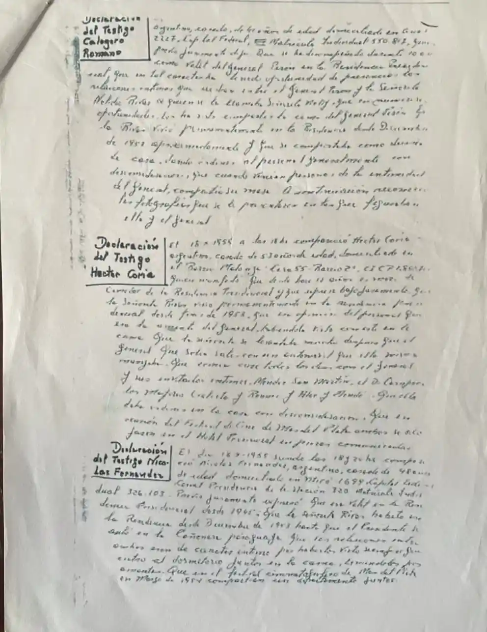 “Declaración del Testigo Nicolás Fernández. El día 18-X-1955 siendo las 18 y 20 hs. Previo juramento expresó que era valet en la Residencia Presidencial desde 1945. Que la señorita Rivas habitó en la Residencia desde Diciembre de 1953 hasta que el Presidente se asiló en la Cañonera paraguaya. Que las relaciones entre ambos era de carácter íntimo por haberlos visto siempre que entró al dormitorio juntos en la cama, teniéndolos por amantes. Que en el festival cinematográfico de Mar del Plata en marzo de 1954 compartían un departamento juntos”.